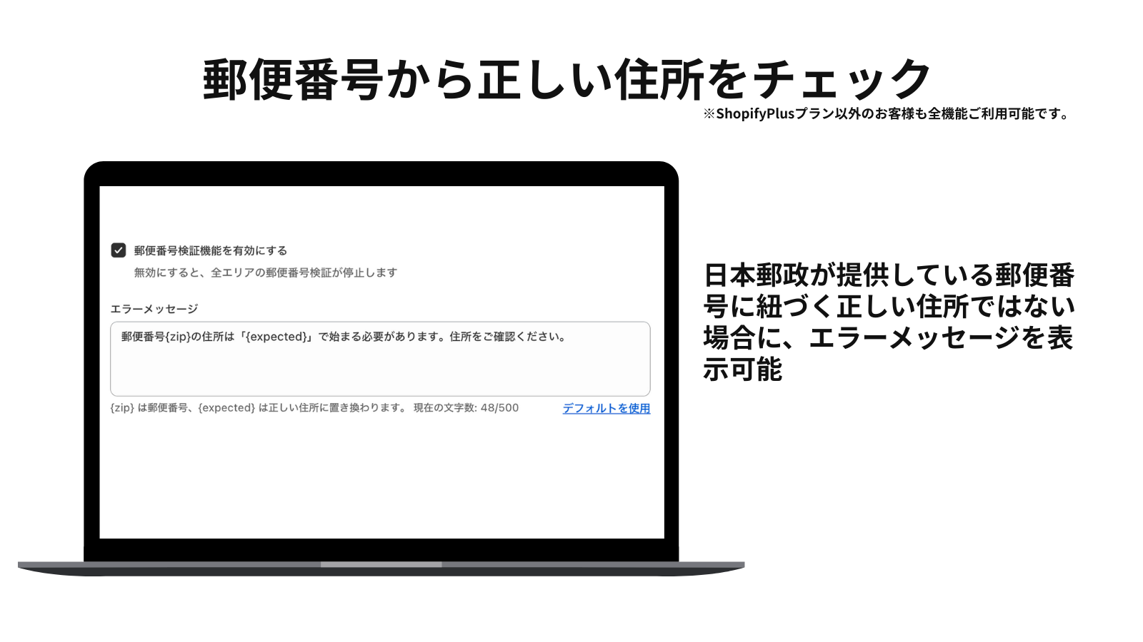 チェックアウトで住所入力ミスをリアルタイム検知し、正しい住所を表示。送り状発行システムのエラー、住所入力の不備による顧客対応コストを削減します。Plus以外のマーチャント様も全機能を利用可能です。
