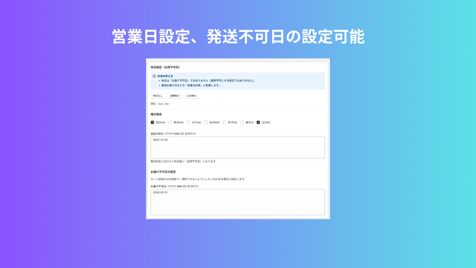 カート画面や商品ページに配送カレンダーを表示し、 お客様は希望日・時間を直感的に選択できます。 営業日・休日・締切時間(カットオフ)・リードタイムを考慮して 選択可能な日付を自動判定するため、 対応できない日時の指定や人的ミスを防止します。 商品タグによる配送日時指定の可否制御にも対応しており、 一部商品では日時指定を非表示にするなど、 ストア運用に合わせた細かな制御が可能です。 設定内容は App Proxy 経由で安全に配信され、 カート内容の変更にも自動で追従します。 シンプルなUIで、テーマや既存購入導線を崩さず導入できます。
