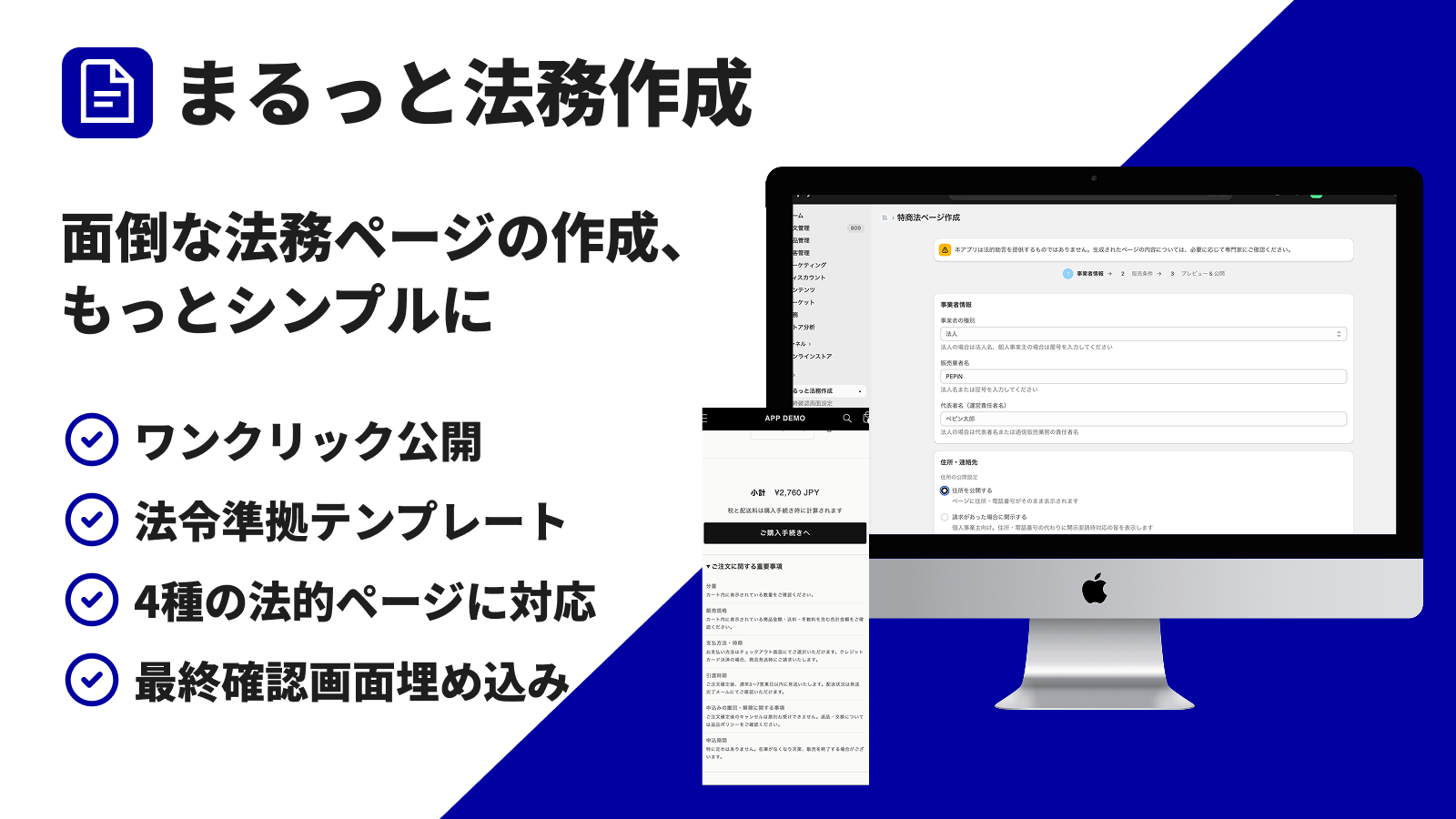 ECサイトに必要な法的ページをかんたん作成。特定商取引法・プライバシーポリシー・利用規約・返品ポリシーの4種と最終確認画面に対応しています。