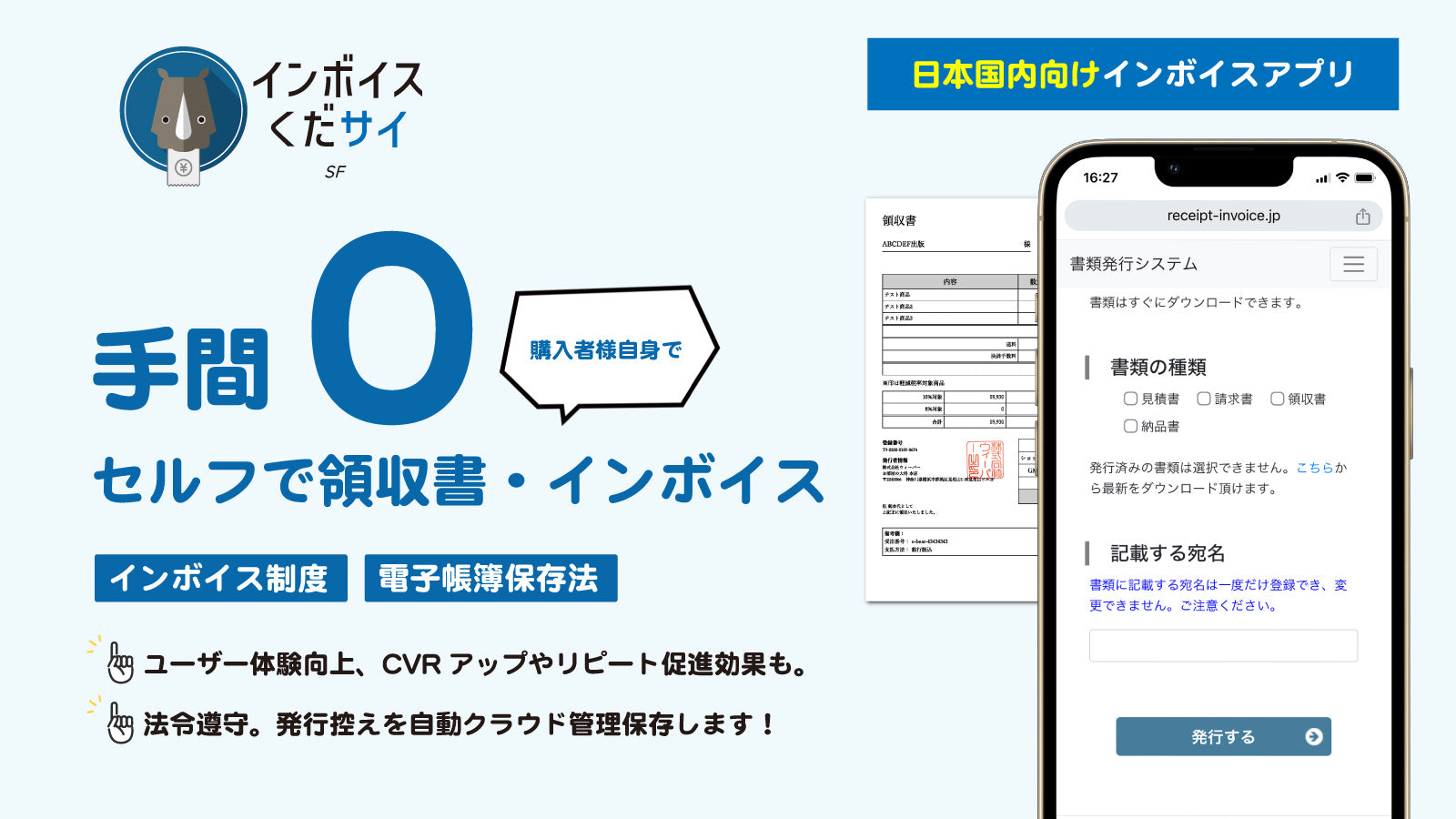 手間0!領収書やインボイスをセルフ発行&保存管理。インボイス制度、電子帳簿保存法対応。