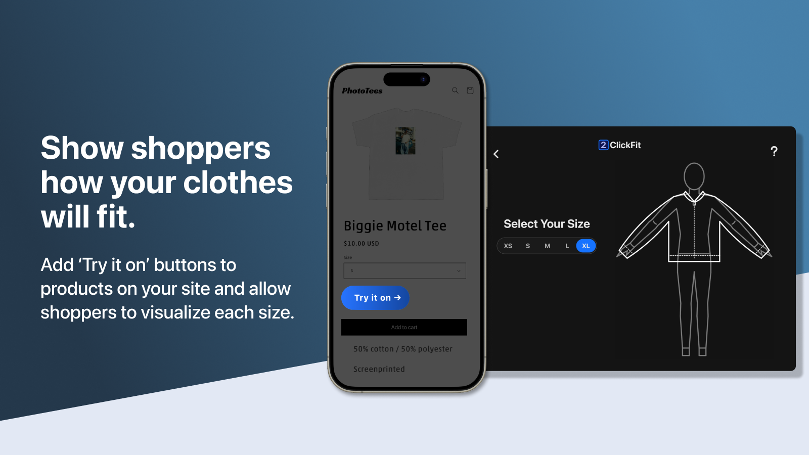 Allow new shoppers to confidently pick their size before they purchase. Our hassle-free try-ons only require shoppers’ height, weight, and gender to display the fit of your items.