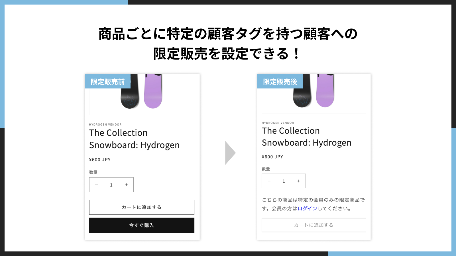 日本製の顧客タグごとの購入制限アプリ。特定のタグを持つ顧客への限定販売を簡単に実現できます。