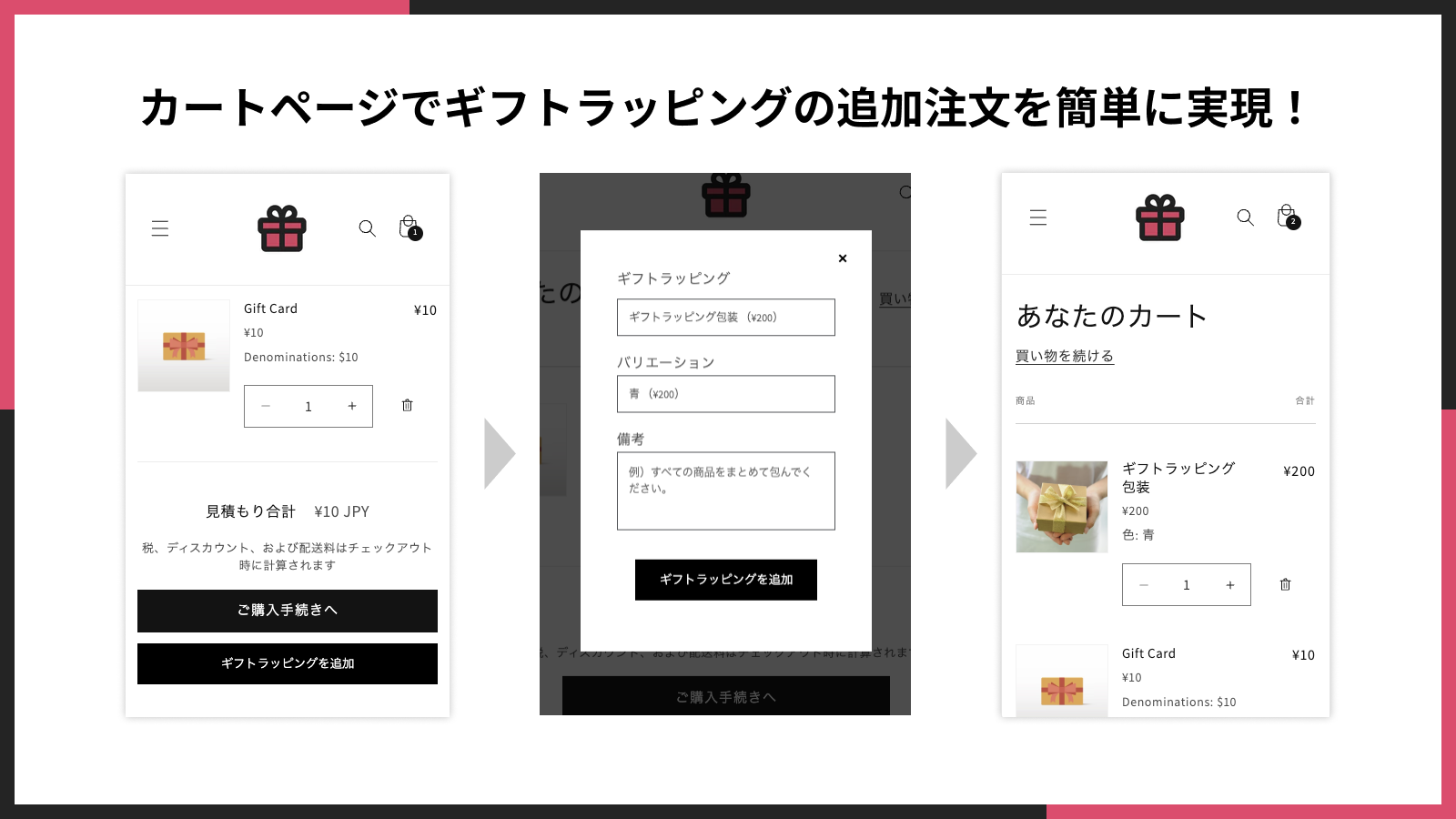 シンプルな日本製のギフトラッピングアプリ。カートページに簡単にギフト包装オプションを追加できます。