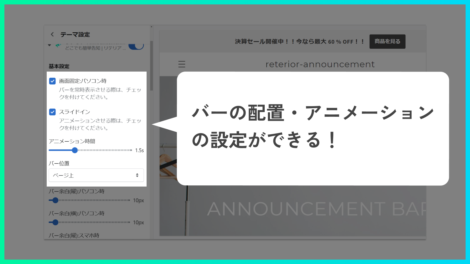 あらゆるページで、顧客にお知らせを告知! 「トップページにアナウンスメントバーをつけたい...」 「高カスタマイズな告知バーを作成したい,,,」 その悩みを解消できるのが『リテリア アナウンスメントバー』です! 本アプリを使用することで、コード編集なしで告知バーを導入することができます! さらに、セクションの設定欄から背景画像やアニメーション、バーの配置を変更することが可能です。 リテリア アナウンスメントバーを使用して、コンバージョン率を上げましょう!