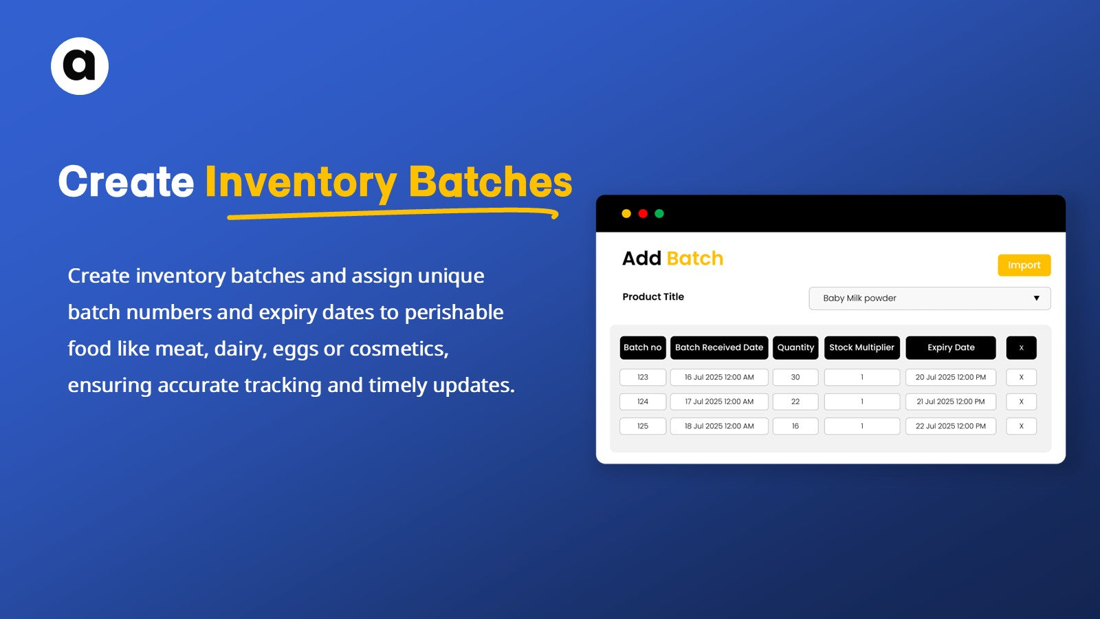 Keep your inventory fresh and your customers satisfied with our advanced product batch expiry tracking app for Shopify. Easily assign expiry dates to products or batches, receive timely alerts, and automatically hide or discount items as they near expiry. Perfect for businesses selling food, seasonal products, supplements, cosmetics, and other perishables. Reduce waste, stay compliant with industry standards, and build trust by always delivering fresh, high-quality, and up-to-date products.