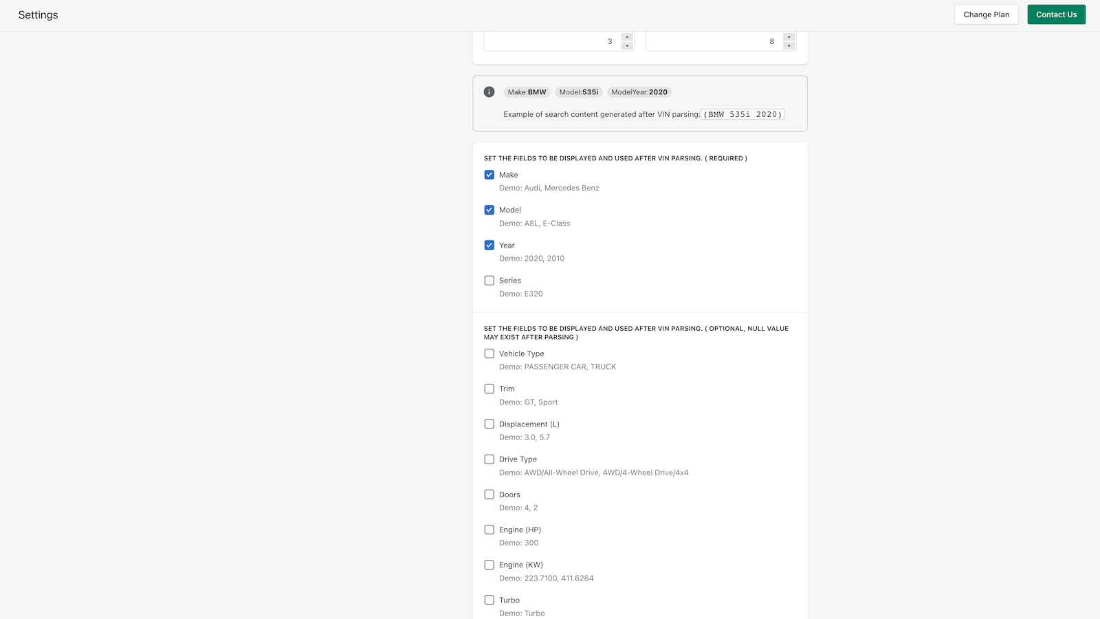 Add an input box in the store to guide the user to input the VIN number of their vehicle in the store, and separate the VIN number into fields such as the brand, model, year and trim of the vehicle. Using these separate keywords to search for products or collections through the store search function. VIN Number fields that can be resolved * Make * Model * Year * Series * Trim * Doors * Engine * Turbo