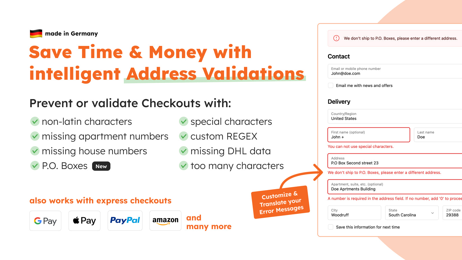 Checkout Validation & Address Validation - Avoid po boxes, missing house number & special characters