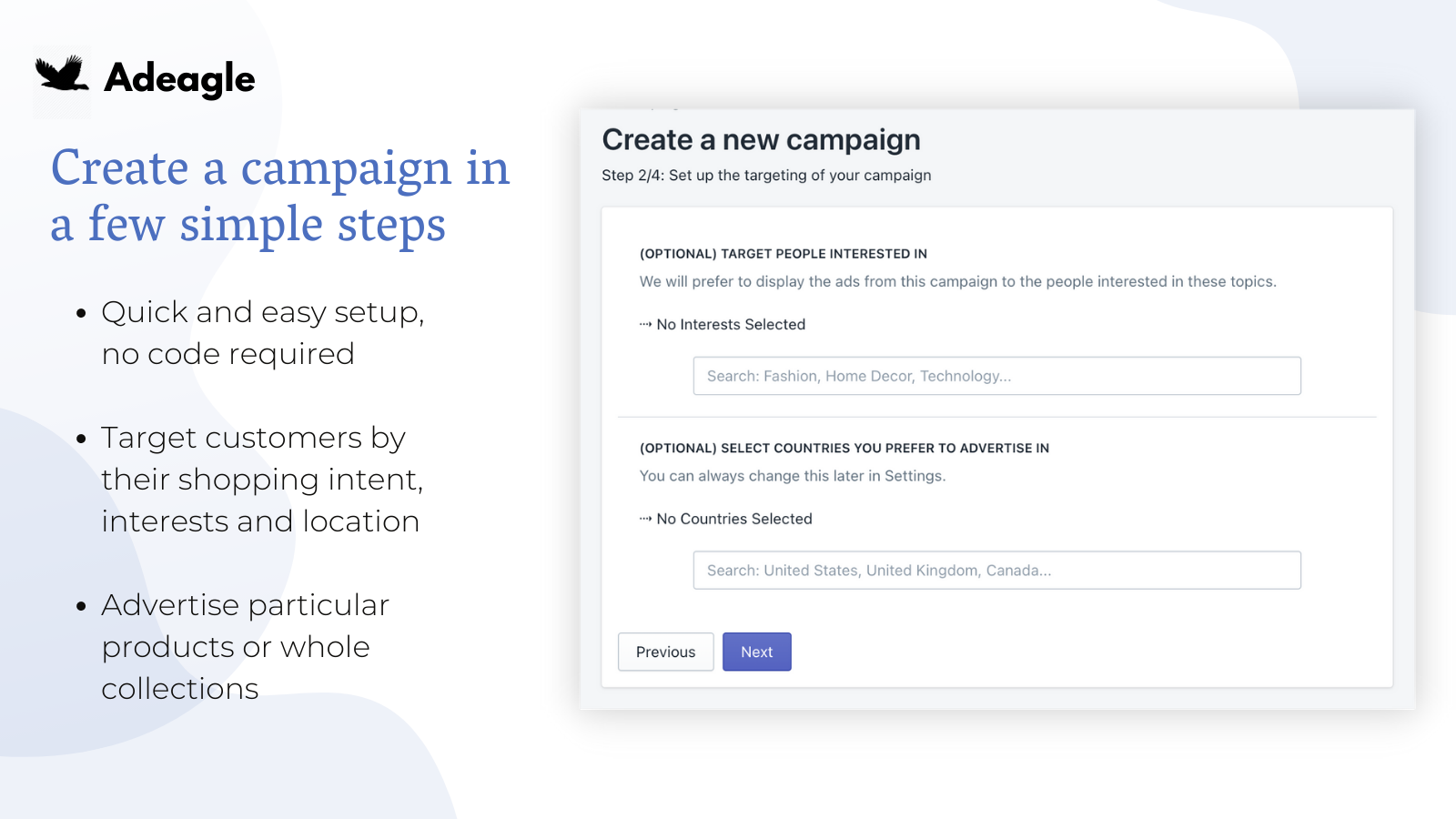 Adeagle lets you easily target and retarget users interested in your products with personalized marketing campaigns. Shoppers research blogs, forums, watch product videos or use mobile apps to find good deals. When they are ready to buy, they are browsing other shops, similar to yours. With Adeagle, you can display ads optimized by AI exactly in these places, exactly to these people. For example, we will showcase your products on pet blogs among pet enthusiasts if you sell pet supplies.