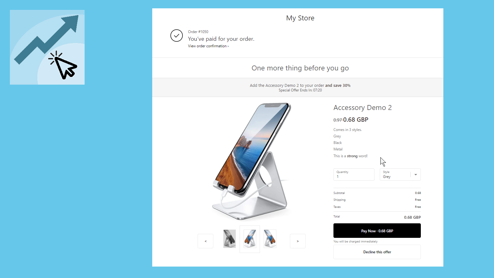 Boost your average order value with post-purchase upsell directly integrated with Shopify's native checkout. In just One Click, the upsell product is added to the existing order and charged for. Shopify Post Purchase Upsell leverages Shopify Checkout, naturally providing you performance, reliability, security, and a guarantee for a good experience for customers.