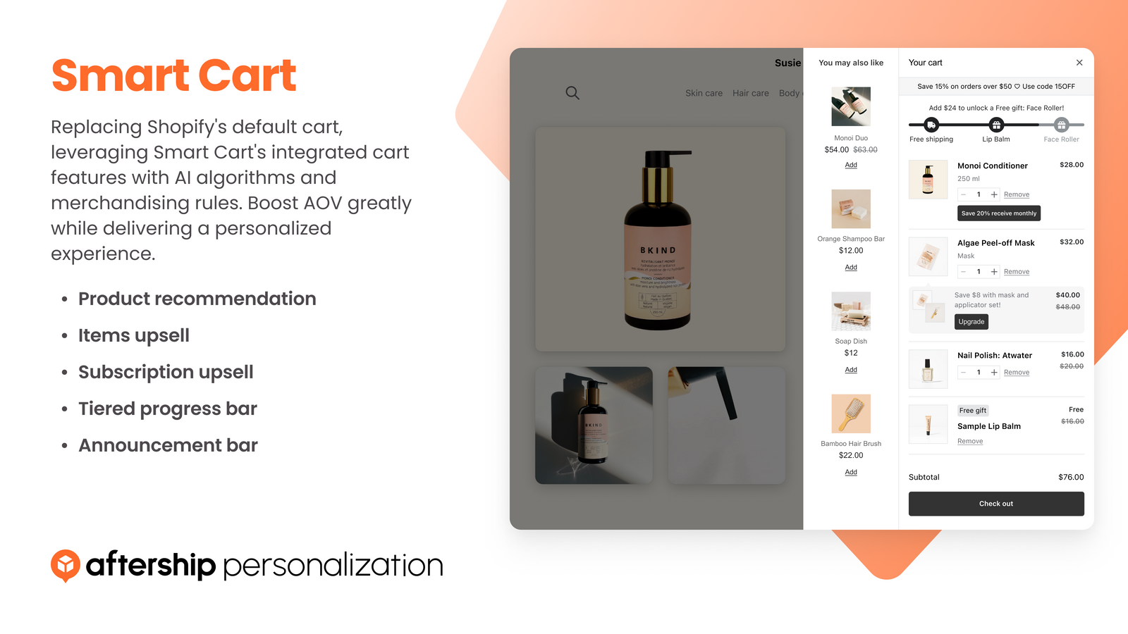 AfterShip Personalization provides personalized product recommendations to help brands boost AOV and conversions and maximize store revenue. Advanced AI-powered algorithms, merchandising rules, and various conversion tools enable upselling across touch-points—from the home page to the cart page/drawer, checkout page, post-purchase OCU pages, etc.