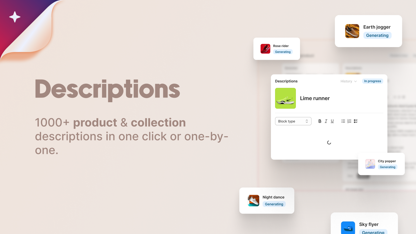 AI-powered tool that generates SEO-optimized content for your products and collections. With just one click, you can create image alt texts, meta tags, and descriptions that convert. Our fine-tuned AI model has been trained on data from millions of successful stores, ensuring that the content generated maximizes conversion rates and organic traffic. AI Genie is the perfect solution for businesses looking to streamline their content creation process and save valuable time