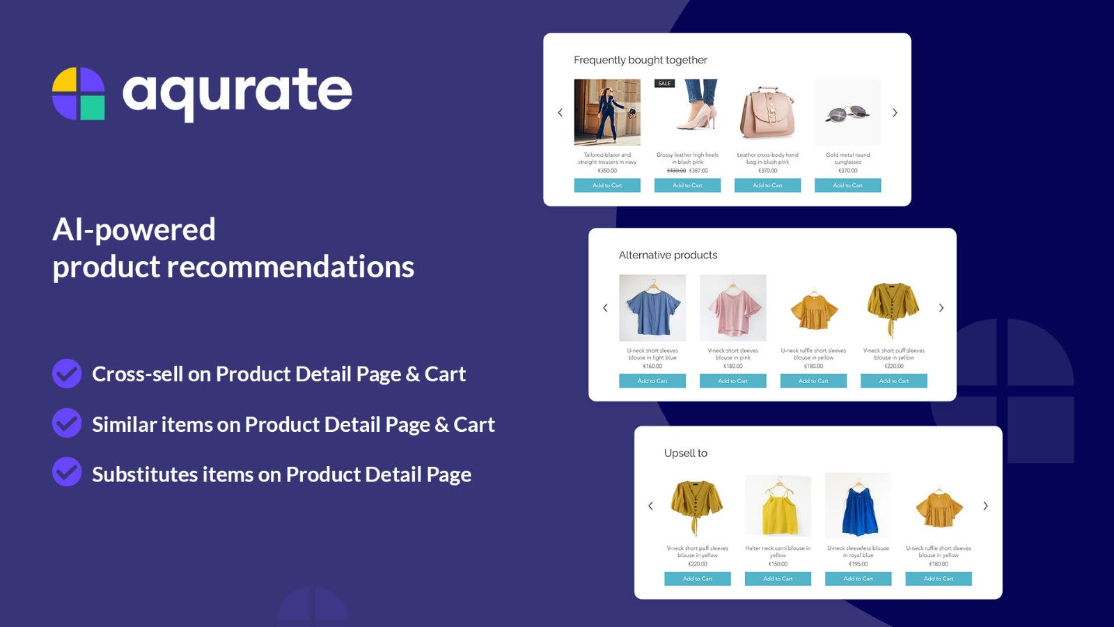 Aqurate Personalize helps eCommerce shops increase the conversion rate, the average order value, and customer retention by offering their visitors a personalized online shopping experience. Using AI-driven technology, Aqurate delivers highly targeted product recommendations to each customer, based on their previous interactions with the shop. Over 10 product recommendation types (e.g. cross-sell, upsell, similar) can be displayed on the website (product detail page, cart) or sent by email.