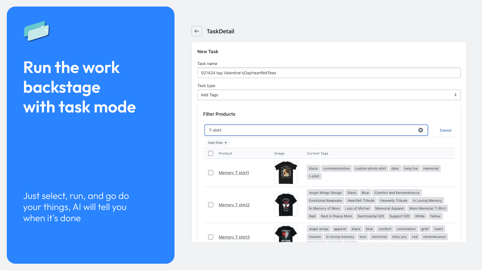 AI model reads your product images, tags them, and writes SEO titles for you in bulk. New streamlined Task Mode allows you to set tasks and move on, with automatic email notifications upon completion. It crafts SEO-friendly, consumer-centric product tags and descriptions, which enhance rankings and shopping experiences. Seamlessly integrated into your workflow, it simplifies collection creation and categorization, enabling you to focus on strategic tasks and boosting operational efficiency.