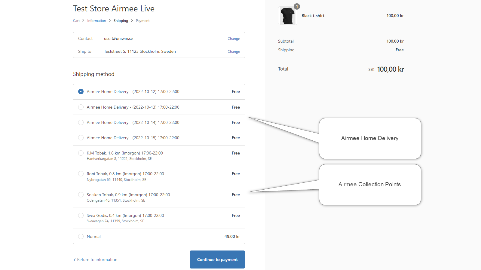 This app will show Airmee’s delivery time slots in Shopify’s Checkout. The selected timeslot will be saved with the placed order and synced to Airmee TA or nShift Delivery as a printable shipping label. You can print the label and book transport within Airmee TA or from nShift Delivery. You can let the sync happen automatically and instantly when an order is received in Shopify store, or you can choose to control everything manually.