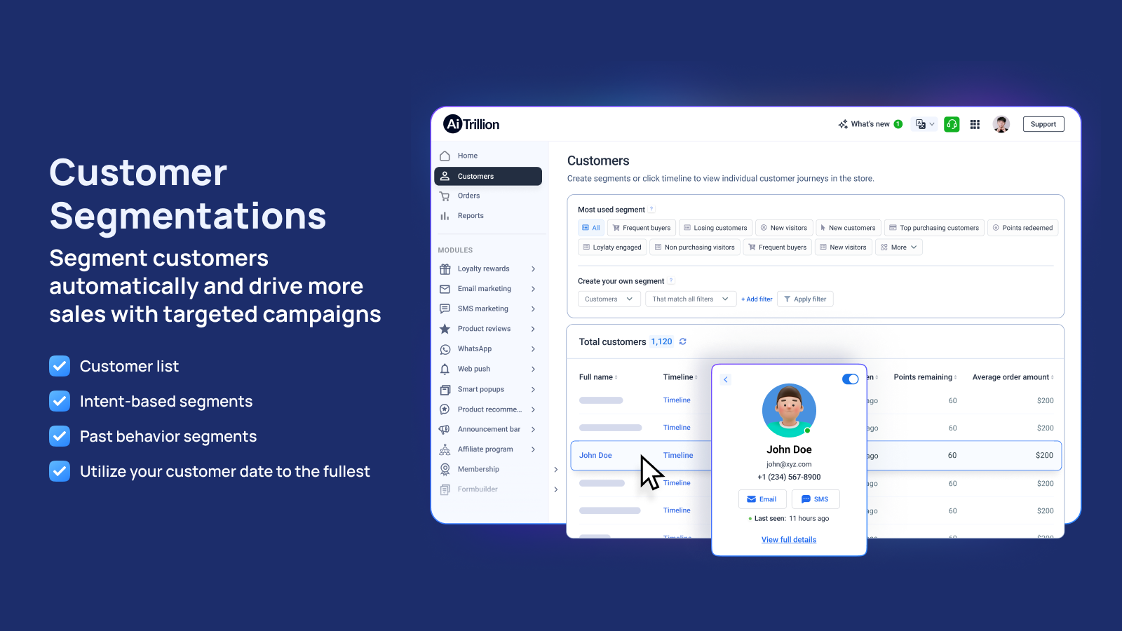 Set up 11+ features from 1 App like a Loyalty rewards program, Referral program, Product Review, Email & SMS marketing. Run mass campaigns & automatic messages using Email, SMS, and Web Push Marketing. Display Product Reviews and Question Answers. Start an Affiliate marketing program, add WhatsApp Chat, & offer Recurring Memberships. Improve your sales with Product Recommendations & upsell/Cross-sell. Engage & retain customers with Automation for BFCM 2024. Setup Customer Profile & Account Page.
