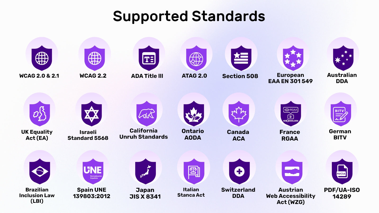 All in One Accessibility widget improves website ADA compliance and browser experience for ADA, WCAG 2.1 & 2.2, Section 508, California Unruh, France RGAA, European EAA EN 301 549, UK Equality Act (EA), Spain UNE 139803:2012, Australian DDA, Israeli Standard 5568, Ontario AODA, Canada ACA, German BITV, Brazilian Inclusion Law (LBI 13.146/2015), JIS X 8341 (Japan), Italian Stanca Act and Switzerland DDA Standards. All in One Accessibility Widget complies with GDPR, COPPA regulations.