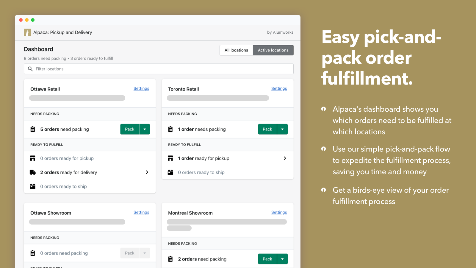 Offer store pickup and local delivery on your terms. You have full control over which days and times to offer pickup + delivery. Set advance notice requirements, limit the number of orders per timeslot, block pickup + delivery on holidays, and more! Use Alpaca's fulfillment dashboard to pick and pack your orders. Print packing slips and picklists, view orders by location, and more! On top of that, Alpaca's support is fast, friendly, and professional. Give us a shot – we think you'll love it!