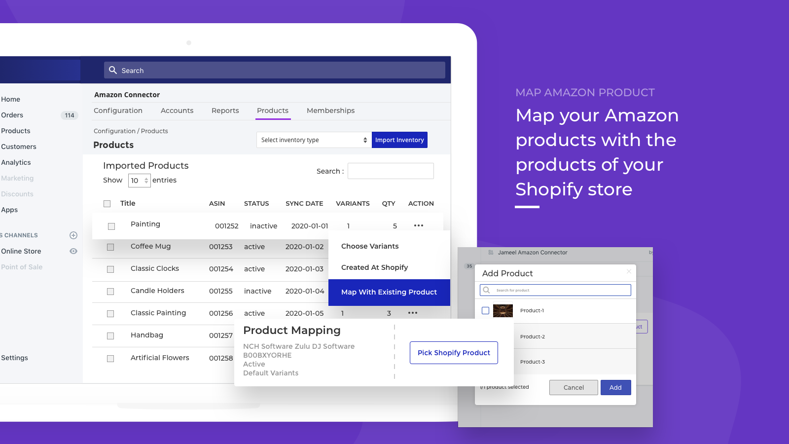 Willing to sell your Amazon products on your Shopify store? If yes, then, Amazon connector will help you to import products from your Amazon seller central account to your Shopify store and map products to manage product inventories on both ends. Benefits: Have a collection of all your Amazon products on your Shopify store. Map Amazon products with your existing Shopify store products. Map Amazon product variants with the variants of your Shopify store products. Track product inventories.