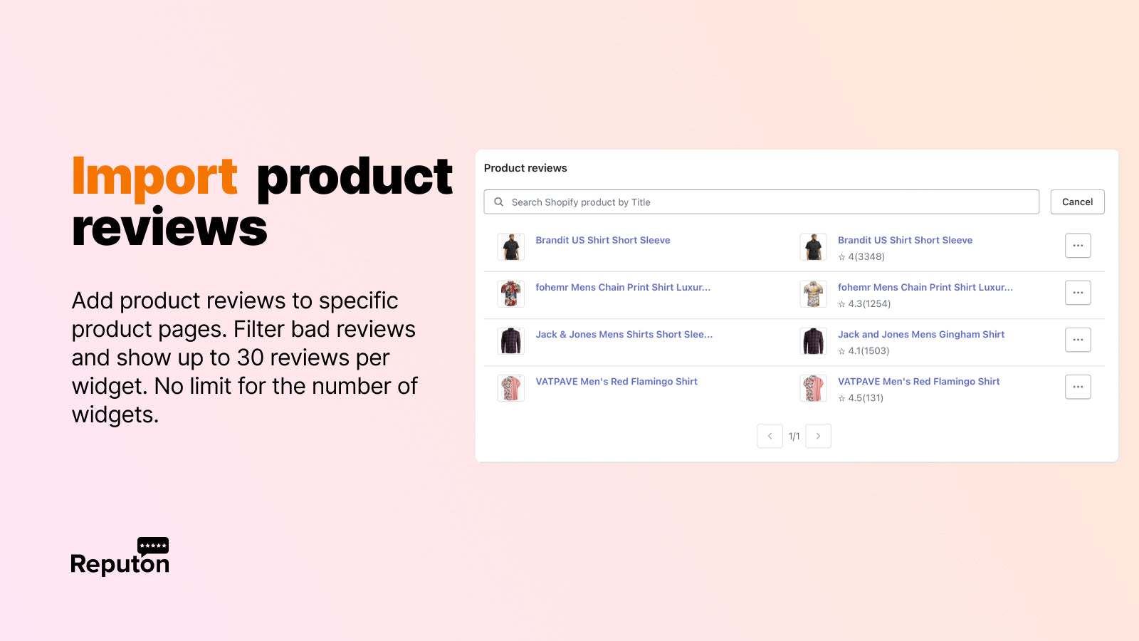 Reputon Amazon Reviews app will help you dramatically improve your site trust, reputation and social proof by displaying awesome rating widgets on your website. Import reviews to your Shopify website in one click. No code is required. Just link your Amazon business or Amazon product page. Easily import Amazon seller reviews and Amazon product reviews. Place Amazon widget on any part of your Shopify store page. Display reviews for Amazon dropshipping products.