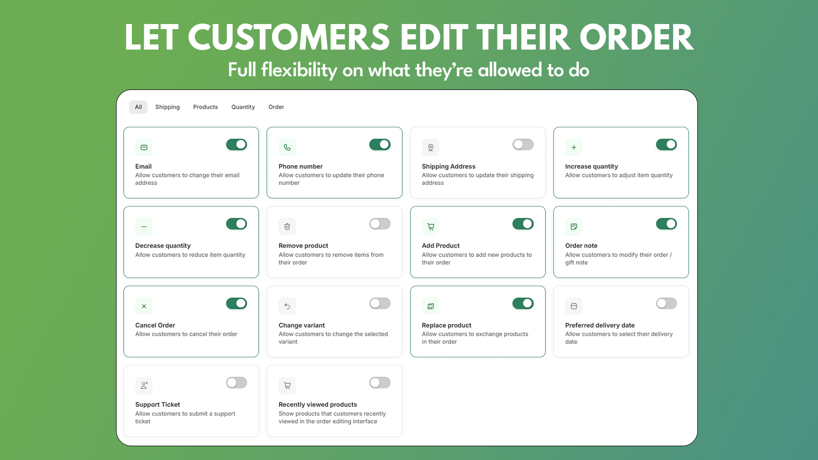 Let customers edit orders after checkout to cut support tickets and prevent cancellations.