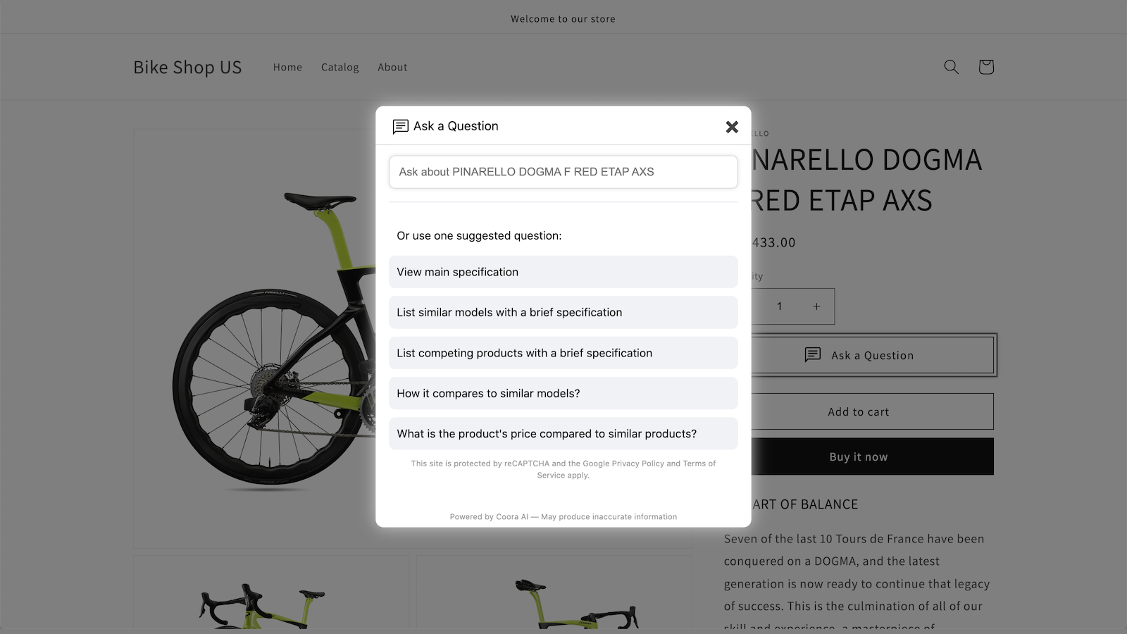 Clarify queries about your products effortlessly with our cutting-edge, fully automated ChatGPT AI-powered responses. By integrating an 'Ask a Question' button on your product page, customers can obtain immediate information, boosting confidence and driving e-commerce conversions. Empower your customers with quick, accurate answers, leveraging AI's capabilities seamlessly. Elevate your sales strategy today by implementing this feature, allowing AI to enhance customer experience.