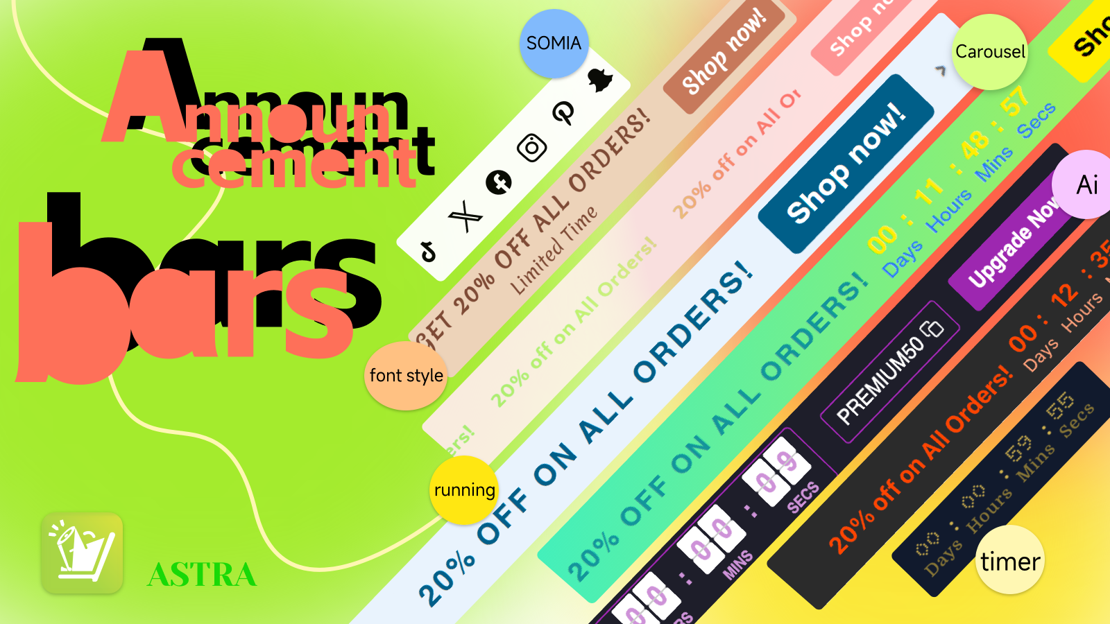 Enhance your store’s visibility and drive conversions with our versatile announcement bar app. Choose from built-in themes or fully customize colors, fonts, and layouts to match your brand. Display promotions, coupons, or urgent alerts in simple, running, or multi-line formats. With flexible positioning (top/bottom) and actionable CTAs, you can effortlessly highlight deals, events, or notifications. Perfect for increasing customer engagement—no coding required.