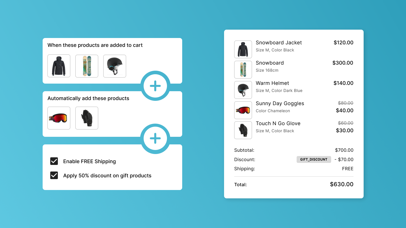 Whether you want to offer a free gift for orders over $100, automatically include shipping, or suggest a matching accessory, our app handles the logic in real-time. By removing the friction of manual selection, you reduce cart abandonment and build stronger customer loyalty through a personalized, high-value checkout journey.
