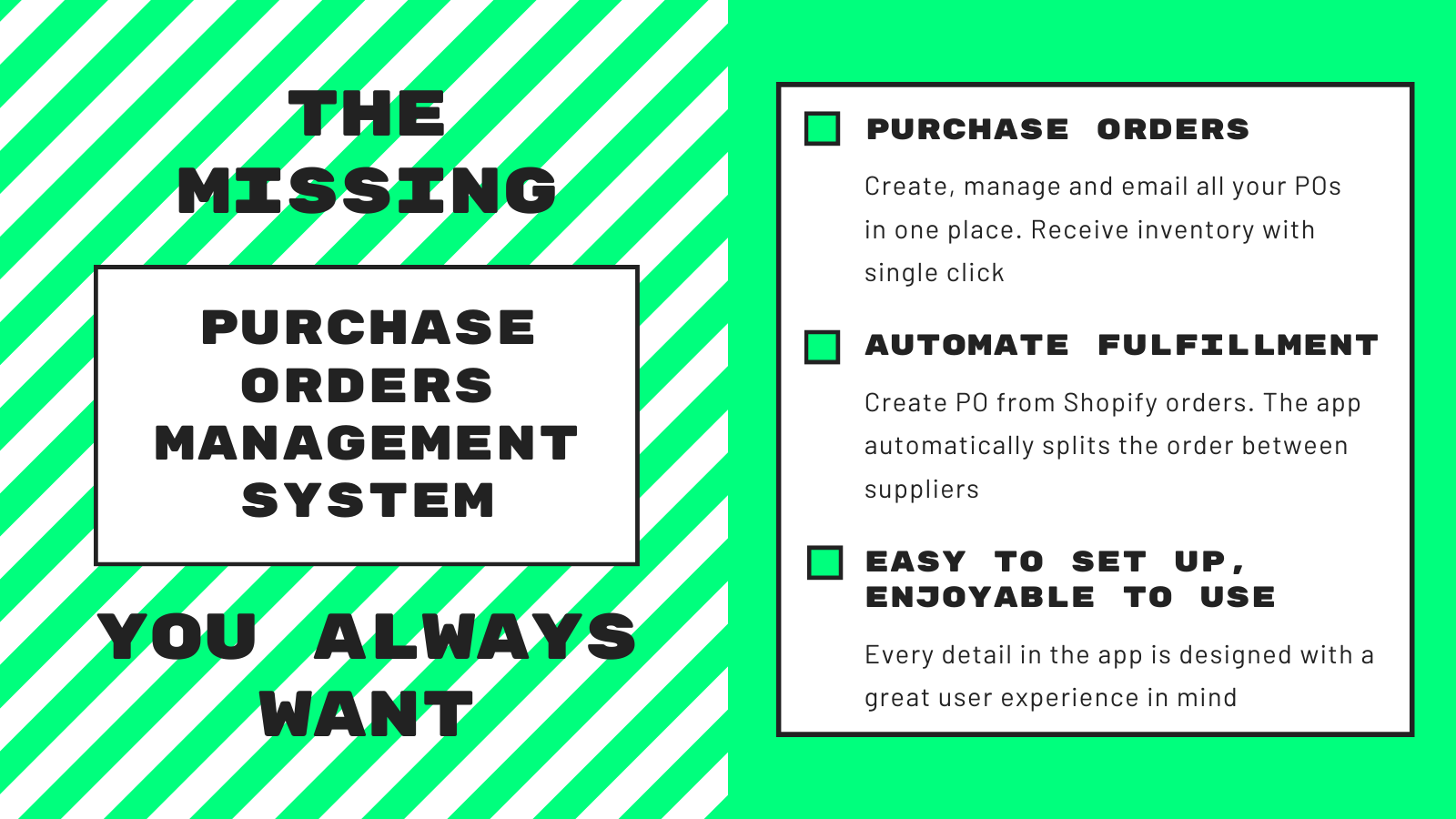 The Auto Purchase Orders app enables you to create purchase orders, manage suppliers (vendors), and track incoming inventory. You can effortlessly generate dropship purchase orders for each store order. Send created purchase orders directly to suppliers via email from your custom domain. Once inventory is received, the app will automatically update the inventory levels in Shopify.