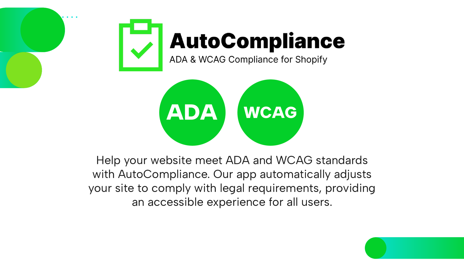 Avoid costly lawsuits and ensure your website is accessible to everyone with AutoCompliance. AutoCompliance instantly helps you meet ADA and WCAG legal standards without any coding. With just one click, AutoCompliance seamlessly integrates with your Shopify store, offering a range of accessibility features to enhance user experience and meet legal requirements.