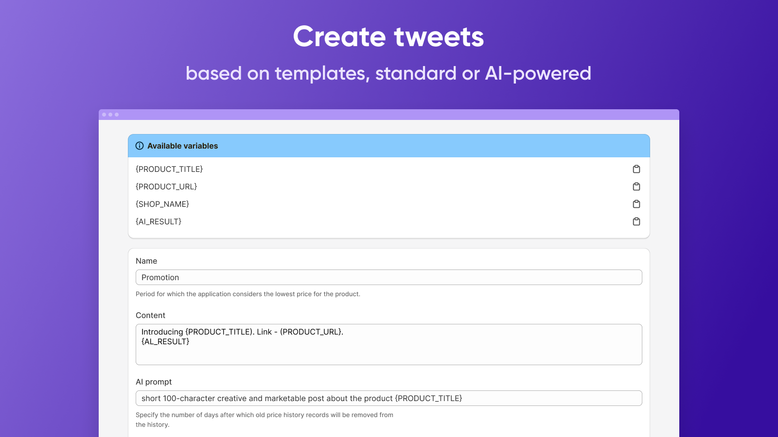 Generate engaging tweets about your products and auto-publish them with AI social media poster app.