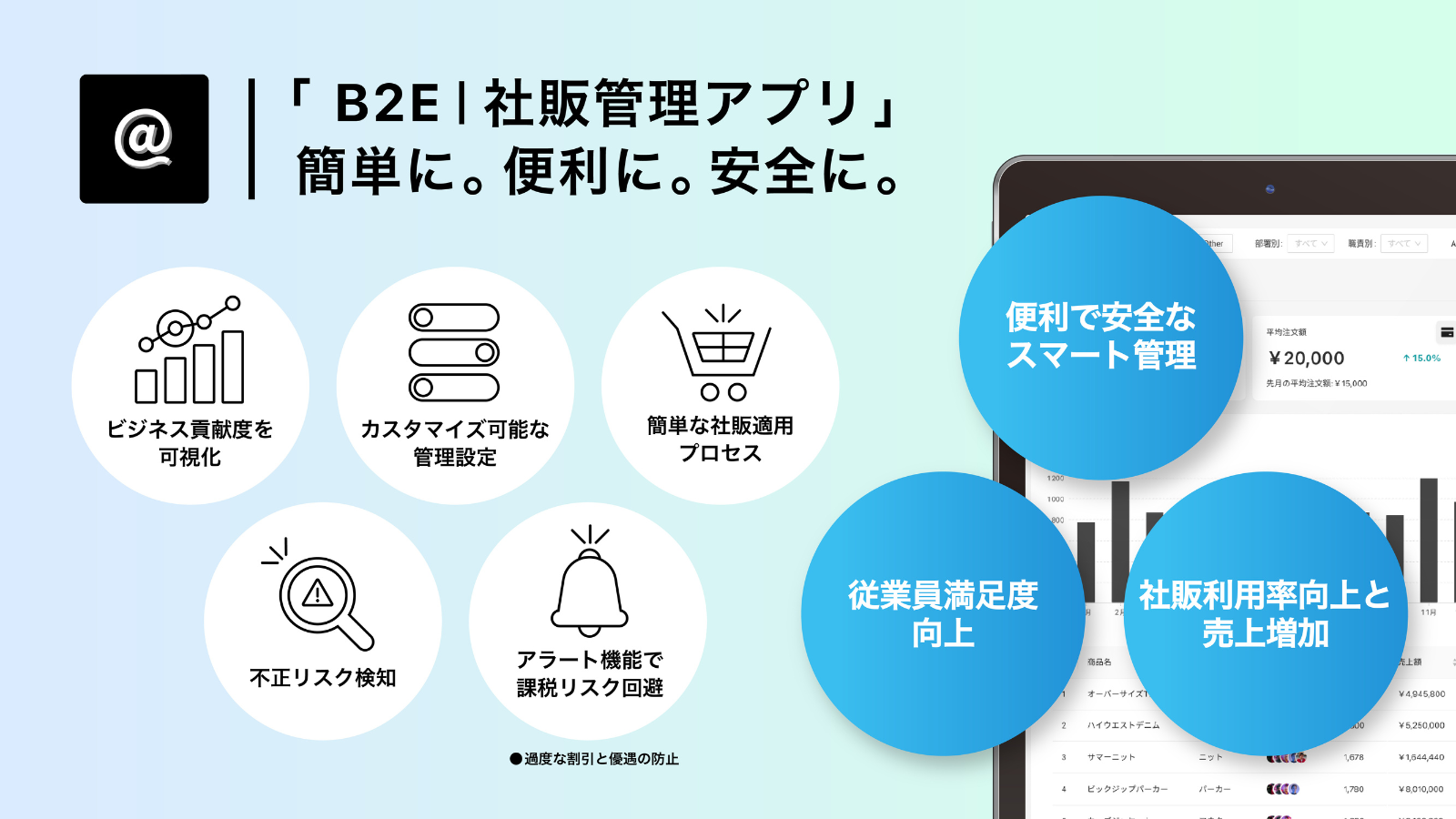 【B2E|社販管理アプリ】は、従業員向け販売(Business to Employee)管理業務において、社販利用プロセスを自動化し、運用効率と透明性を同時に向上させるShopifyアプリです。シンプル導入で既存ストアに即組み込み可能なうえ、購買額を給与から自動差し引く天引き機能や、職責・部署ごとに割引率を自動反映する機能、利用上限設定や承認フロー対応の権限管理、支払いステータス自動再反映、部門や個人単位の利用制限が可能な商品別ブラックリスト、職責・部署別の購入履歴可視化、週次サマリーを含む申請・承認・支払い状況や不正リスクを通知するEmailアラート、人事システムとのAPI同期、役職・部署ベースで細かく設計できる権限設定、管理者向け操作ログ記録など、多彩な機能を標準搭載。さらに直感的なダッシュボード画面で全体状況を一目で把握でき、CSVエクスポート機能でデータ分析も容易に行えます。柔軟なカスタマイズ機能により、企業独自の社販ルールや割引率、承認条件など細かな要件にも対応可能です。導入後は管理負荷とサポートコストを抑えつつ、社販運用の統制と従業員視点の使いやすさを両立します。