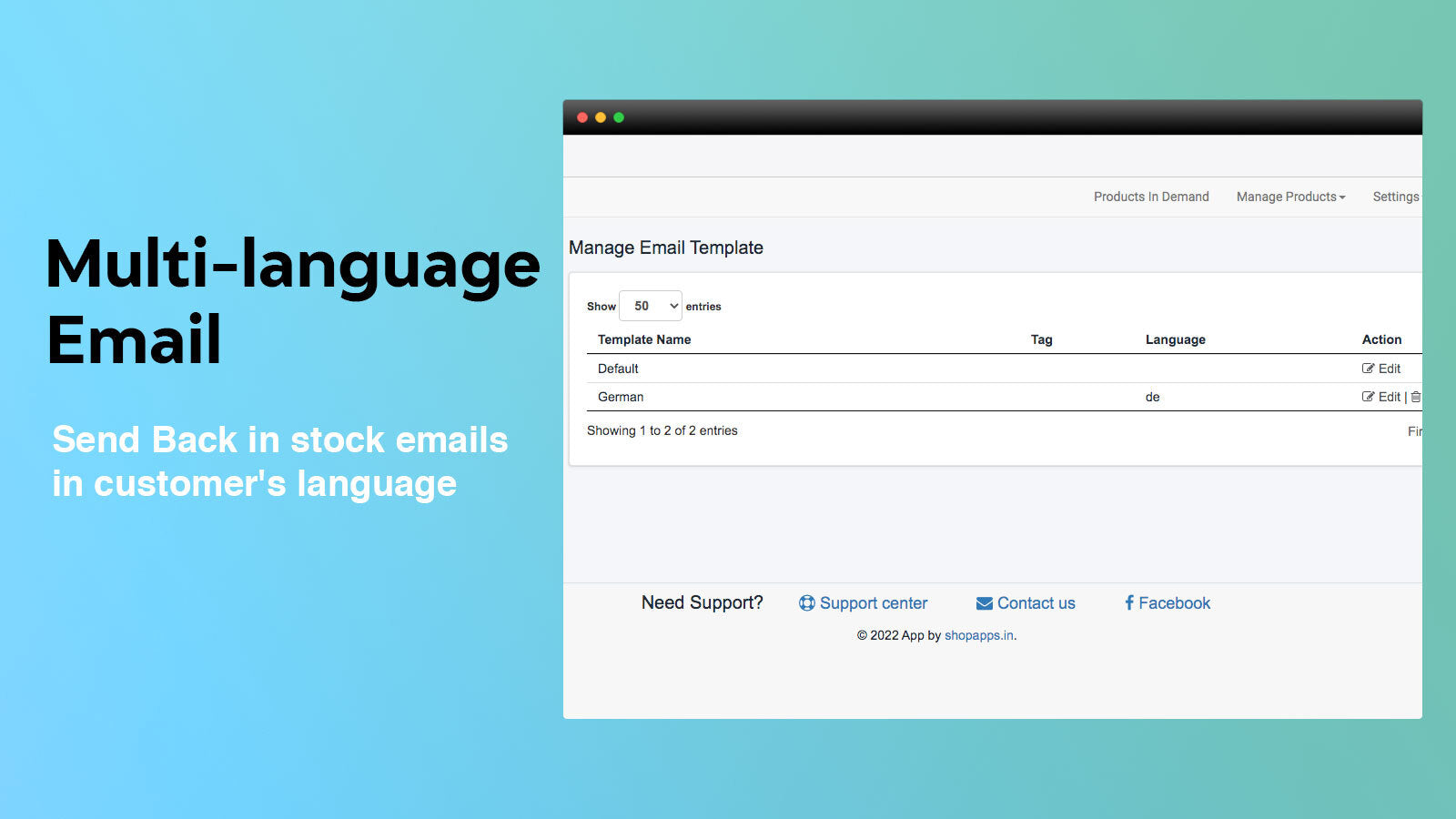 Allow customers to subscribe to email notifications for out-of-stock products. The app automatically sends a notification email when the product comes back in stock. Unlimited subscribers and No limits on emails sent. Include features like email throttling, auto re-subscribe customers, custom email template, back-in-stock emails in customer's language, show availability date or custom message per product, low stock & Out of stock notification to admin, view and remove subscribers & more.