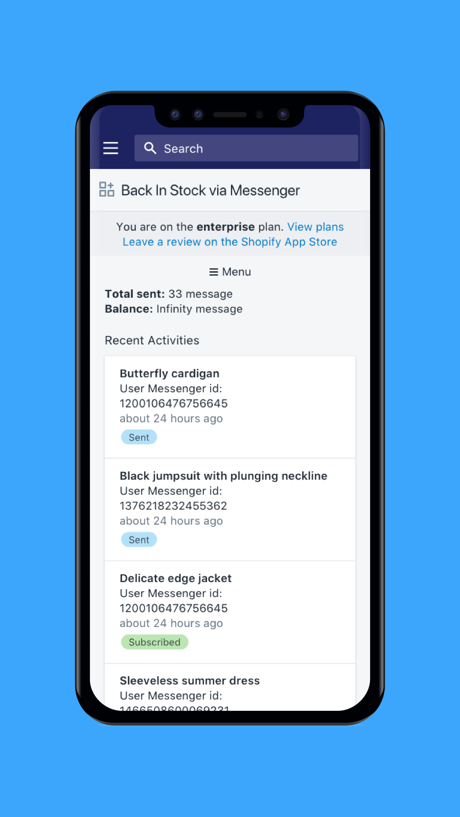 Major Update in June 2018 - Know your sales amount recovered by the app - Understand the whole funnel of your customer actions - See the recent activity with comprehensive details - Customize the "Send to Messenger" button size - Get email updates about required app actions - And of course we fixed a lot of bugs :) New Features in March 2018 – Most Wanted Section Now you can see how much of each product people want. Check the app dashboard and find out your most requested products.