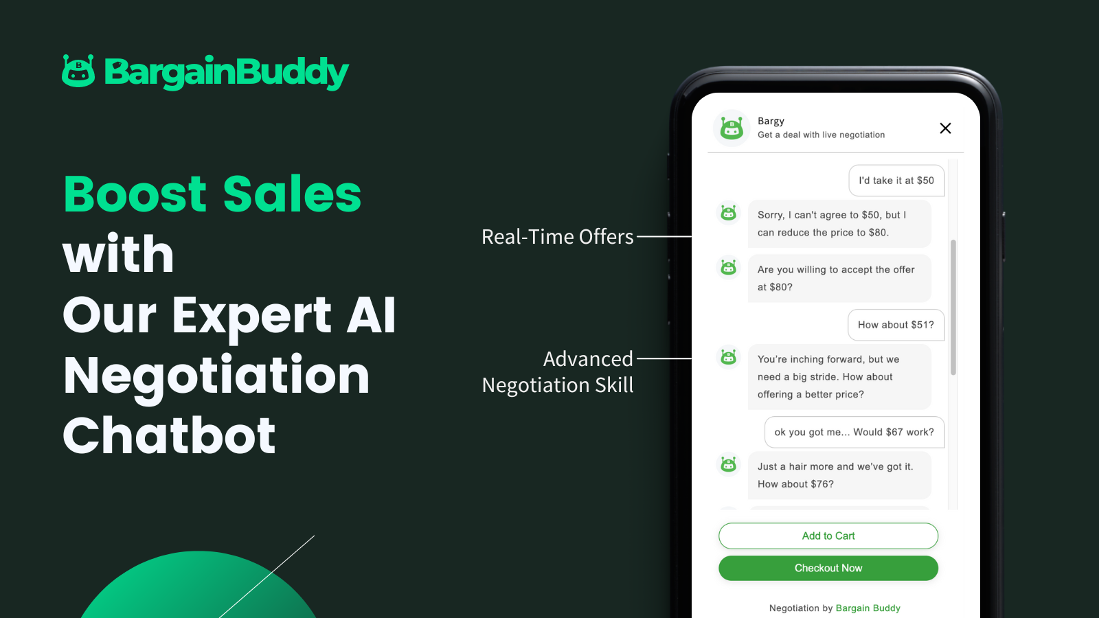 Can't find the most effective pricing or discount percentage that converts the most visitors while maintaining your profit margin? Our chatGPT AI Assistant solves that by finding out the highest price each customer is willing to pay and offering the optimal discount to each customer via real-time negotiations. Your customers can make an offer and receive tailored discounts. You can also customize your chatbot’s look and feel to match your brand. The setup is easy and take less than 5 minutes.
