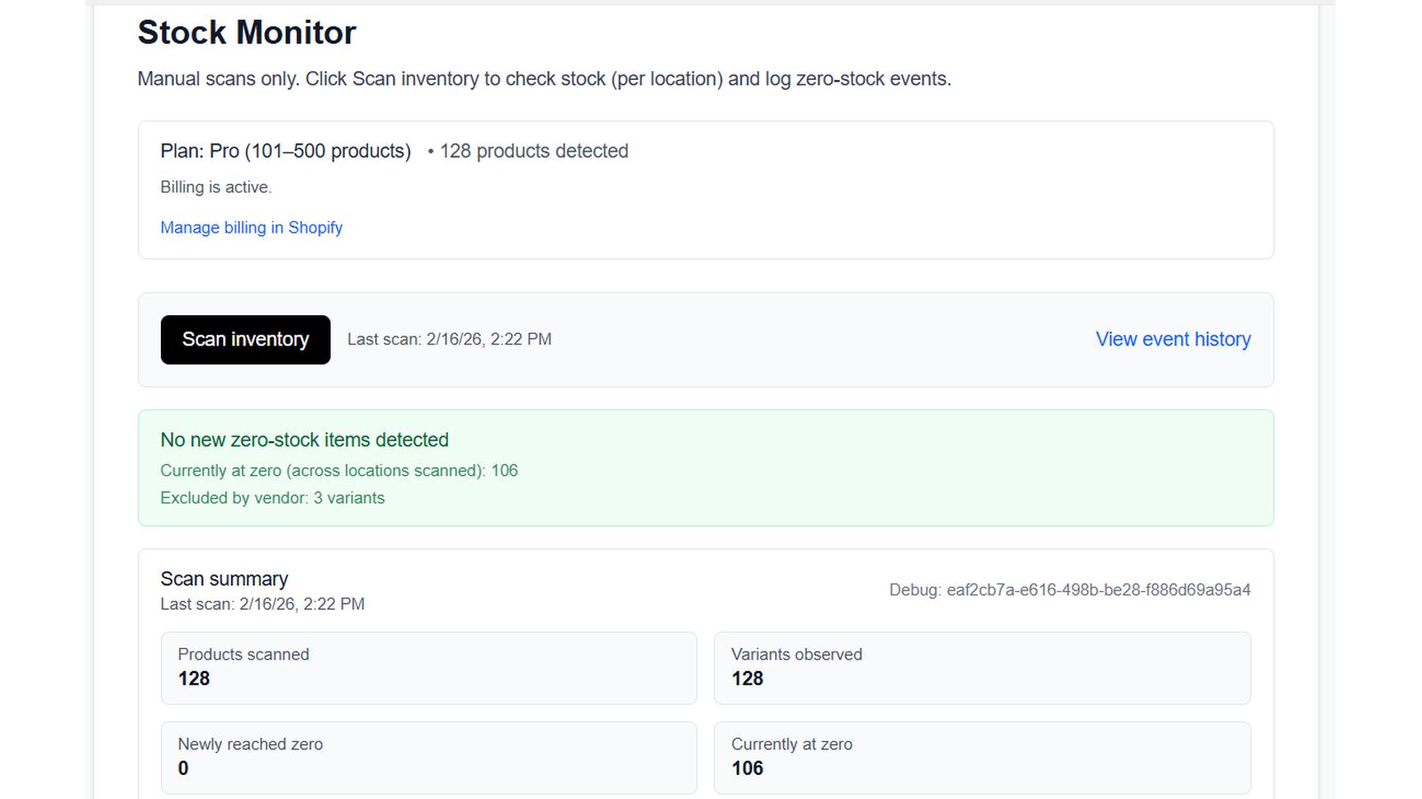 Baseline Stock Monitor helps merchants prevent lost revenue caused by inventory imbalances. With manual, on-demand scans, you can instantly see which online shop products are at zero stock and exactly how long they’ve been there. If a popular item is out of stock online but still available in another location (like a physical store), you can reallocate inventory before sales are lost. Clear “At 0 for” tracking ensures profitable products don’t quietly sit at zero longer than they should.