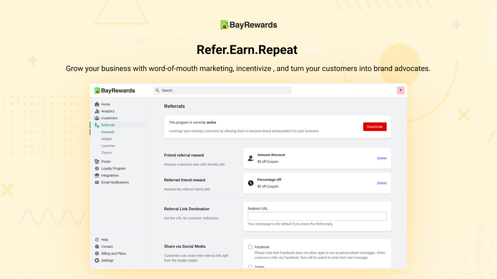 BayRewards is a game-changing platform designed to elevate customer engagement and loyalty for online businesses. Our seamless integration of loyalty programs into captivating activities keeps customers delighted and coming back for more. Unlock the power of referrals with BayRewards' unique feature. Empower customers to share their positive experiences effortlessly, driving customer acquisition and expanding your reach through powerful word-of-mouth marketing.