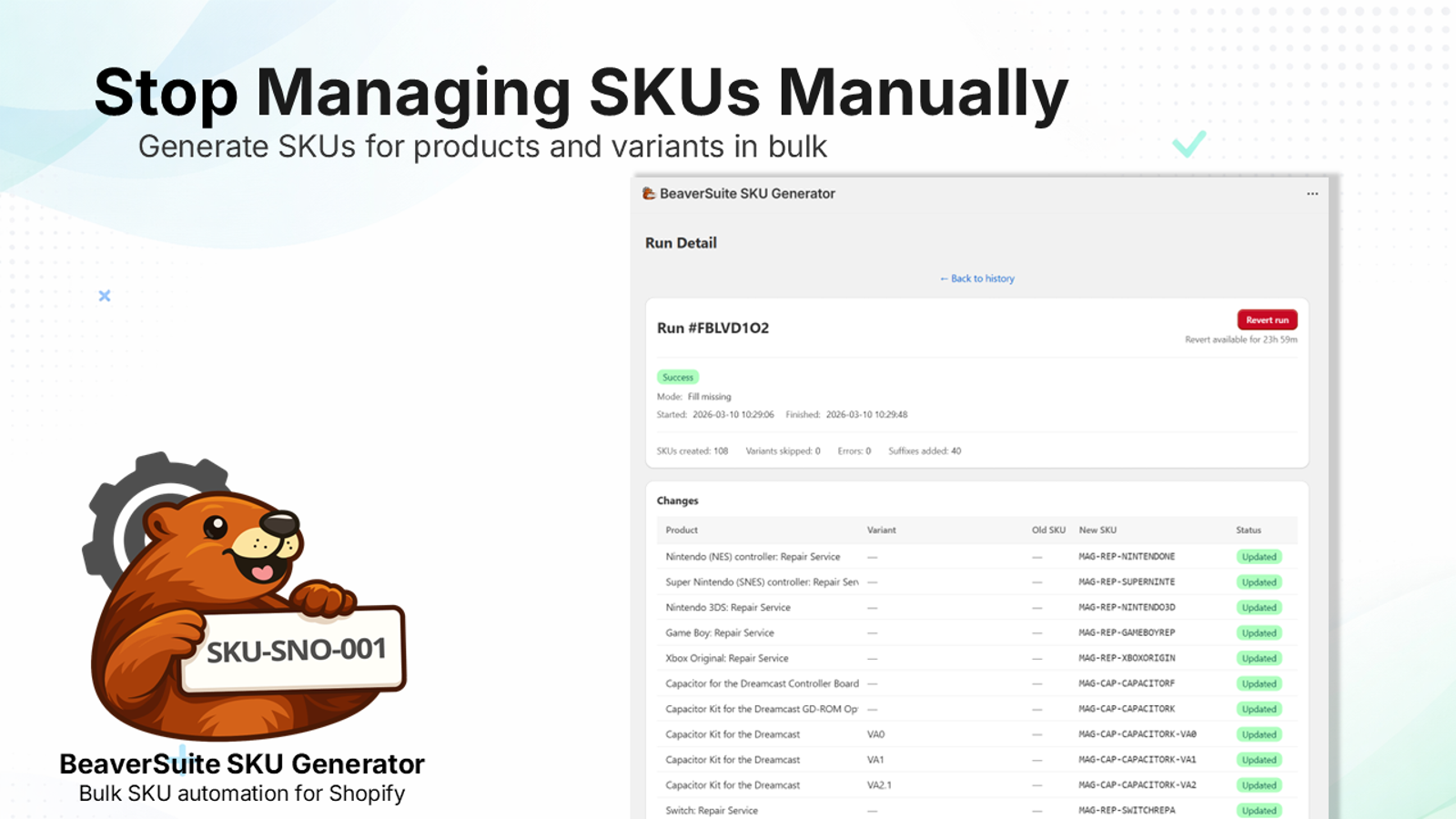 Stop managing SKUs manually. BeaverSuite SKU Generator helps merchants generate SKUs for Shopify products and variants using customizable patterns. Create SKUs in bulk for existing products or automatically assign them when new products are created. Preview SKU changes before applying them and keep your catalog organized by ensuring every product and variant has a valid SKU.