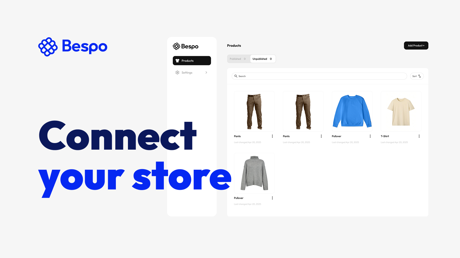 Bespo lets you add powerful product customization to your store in just a few clicks. Enable stunning real-time previews for embroidery, monograms, and textile prints to drive conversions and elevate your customer experience. Easy to configure, fully visual, and built to work out of the box with your existing catalog. Create premium personalized products while keeping your setup smooth and scalable. Easy setup. Beautiful results.