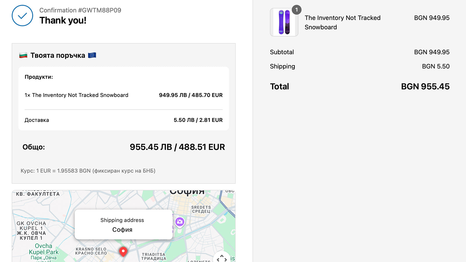 Automatically display all ordered items prices in both BGN and EUR on your Thank You page.