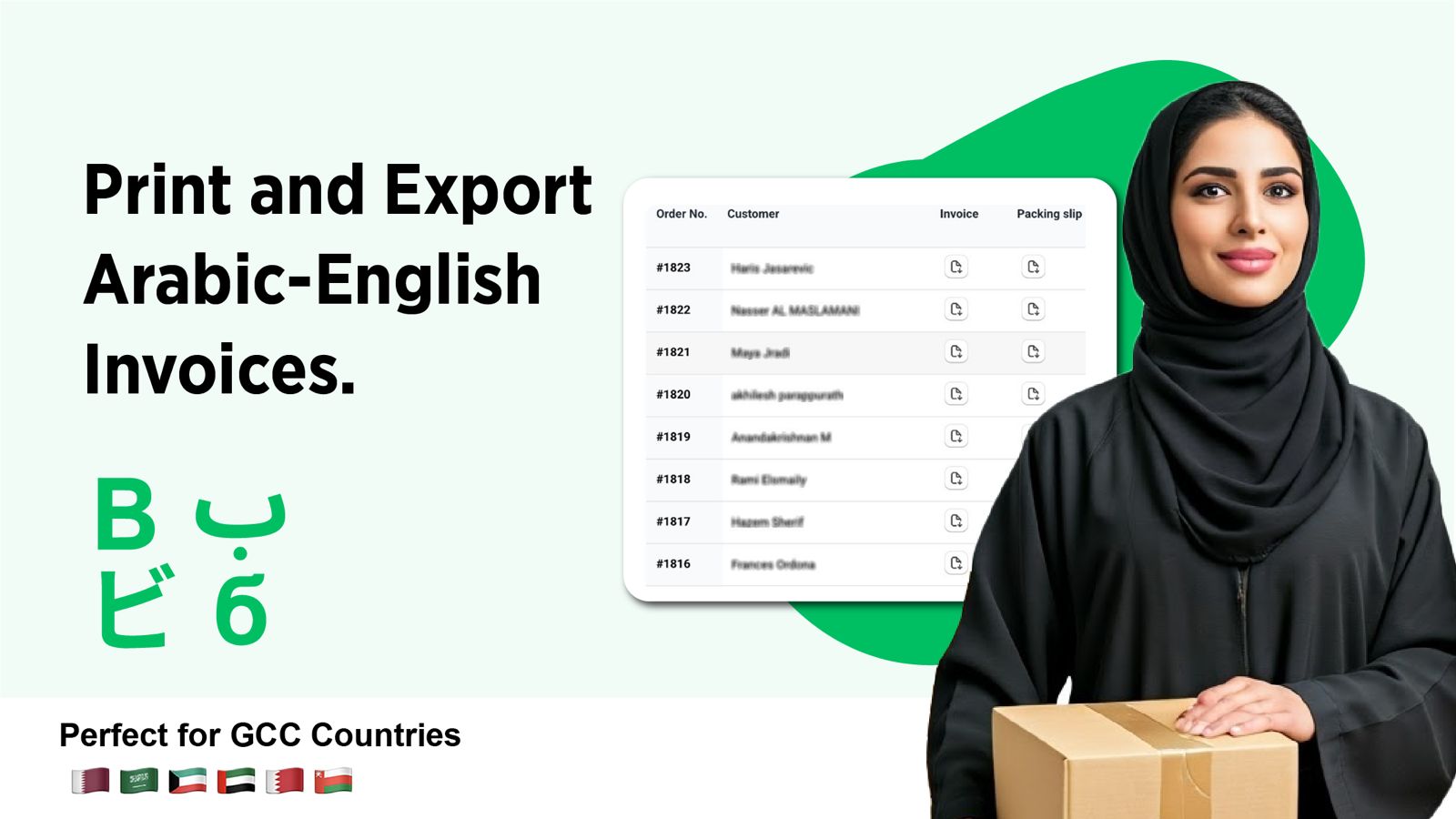 Automated printing of Arabic and English invoices, packing slips, return forms, and receipts.