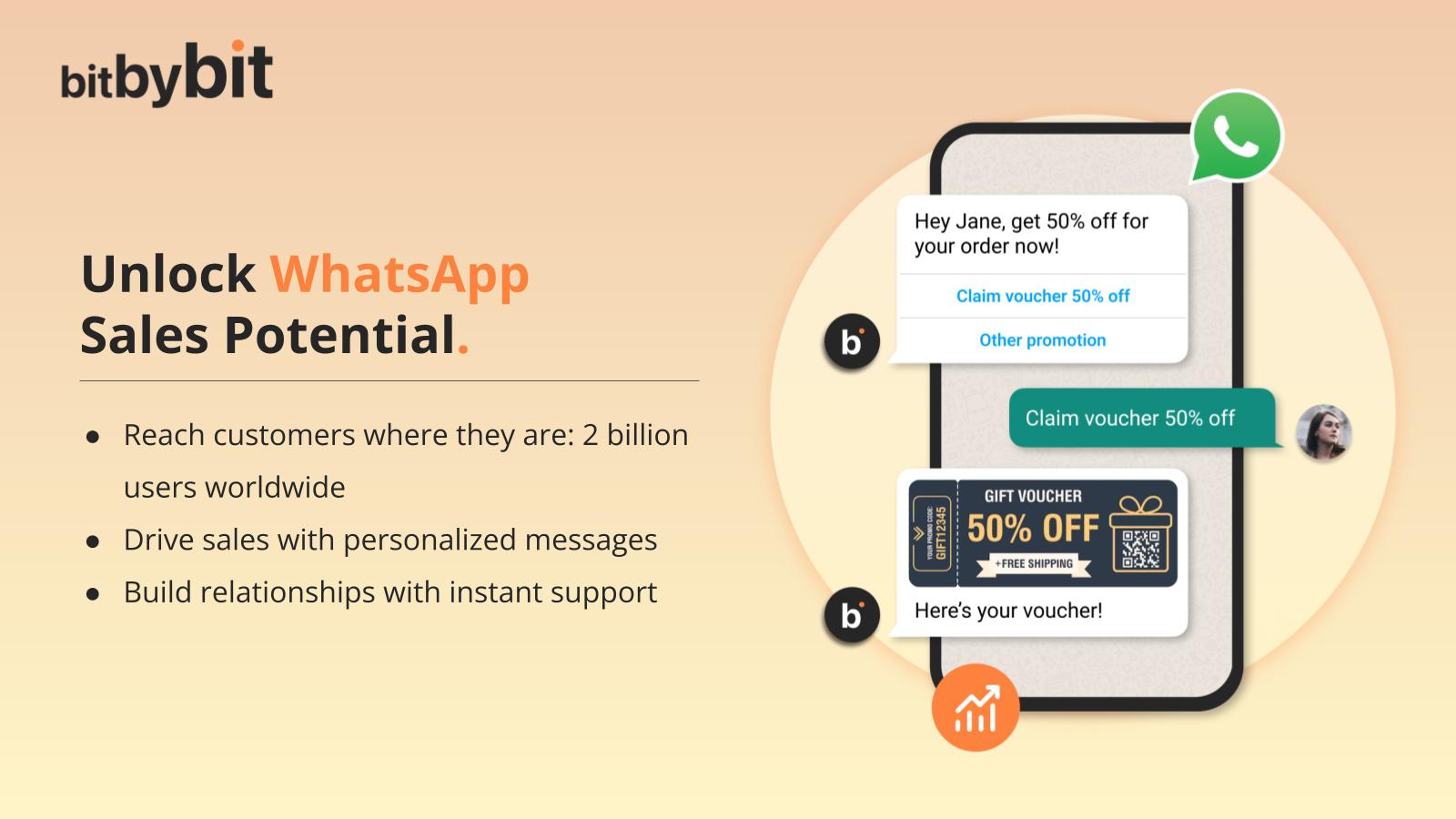 Transform your WhatsApp into a powerful sales tool with bitCRM. Designed for marketing teams, this no-code platform automates essential communications like abandoned cart recovery, order confirmations, and personalized marketing campaigns. Boost your conversion rates and customer engagement effortlessly. Start reclaiming lost sales today!