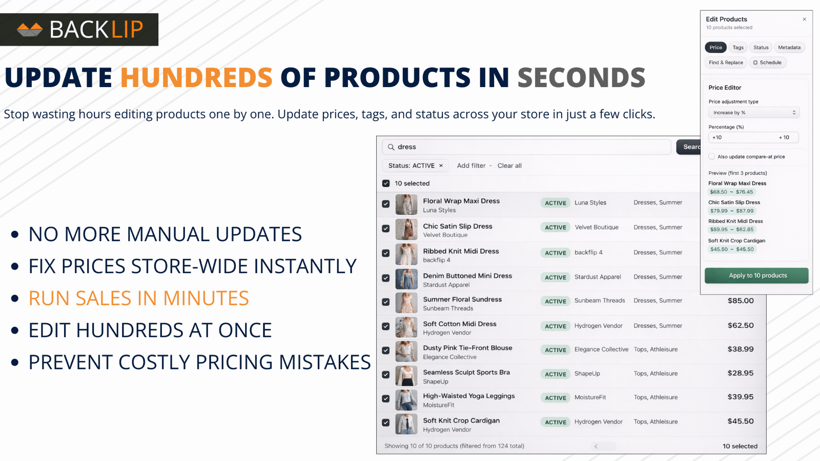 BL Bulk Product Editor lets merchants update thousands of products from the admin with no CSV exports. Edit prices, compare-at values, SKUs, inventory, tags, statuses, and custom metafields across selected products or variants. Use find and replace with optional case sensitivity and regex. Schedule edits to run at a chosen date and time using store automation. Changes run in your store session, use the Admin API, and show detailed success and error reports. For large catalogs.