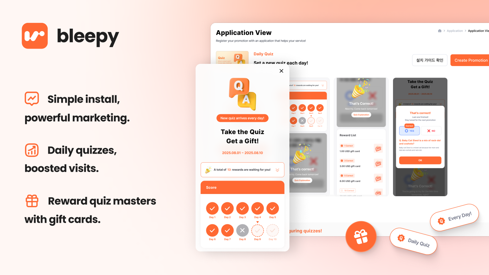 bleepy provides daily quizzes for store users. Design quiz questions and answers to promote your brand. Users who answer all questions correctly automatically receive your set gift cards. Use gift cards to drive purchases, and easily track user data with the provided dashboards.