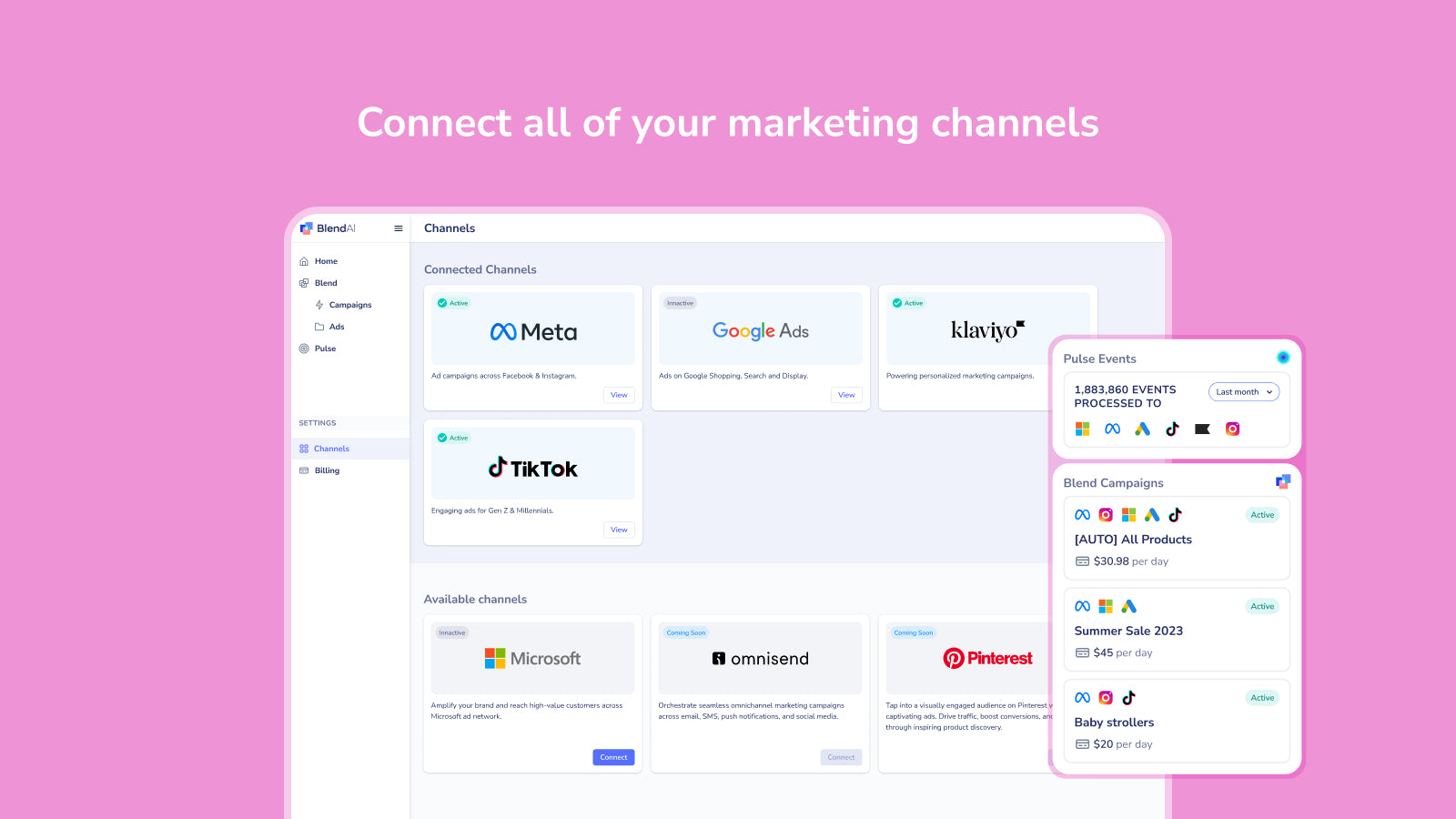 Blend simplifies online advertising across Google, Facebook, Instagram, Microsoft and TikTok. Quickly launch and manage ad campaigns across multiple channels in just seconds. Machine learning algorithms automatically optimize ad performance, boosting sales and ROAS. Start utilizing your first-party data with our "Pulse" add-on for seamless data integration across marketing channels including Klaviyo, to maximise conversions and engage your customers in a post cookie world.