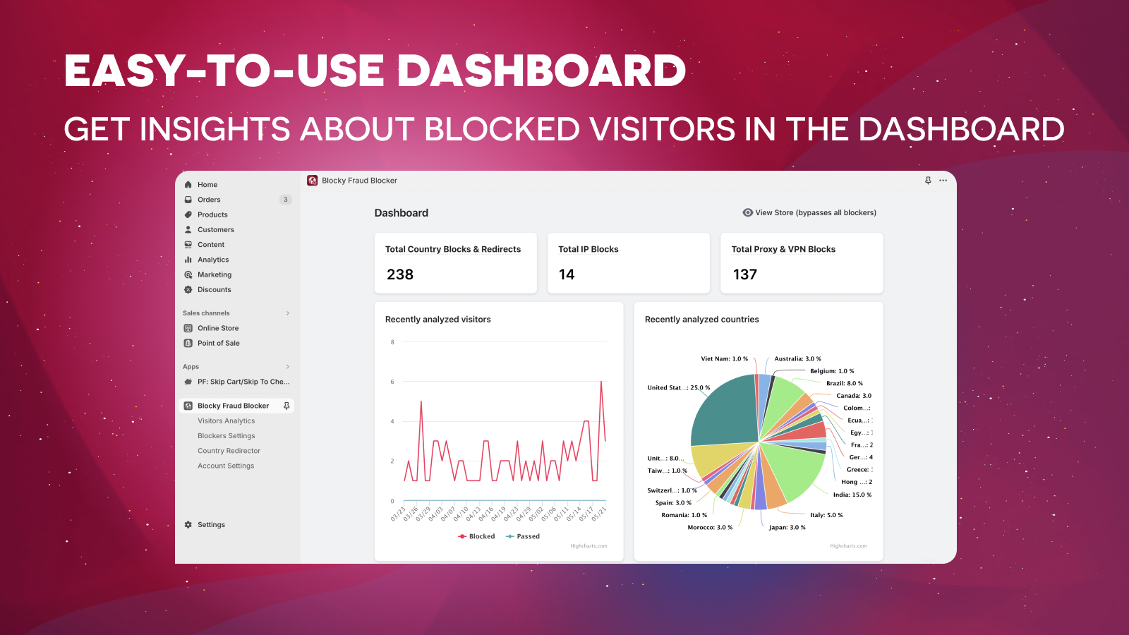 Blocky allows you to easily block visitors by their IP address (including IP ranges) and geolocation country. Blocky's Bot Blocker can increase fraud prevention, filter & block bots, scammers, spy block & block copycats that use VPN/proxy connection. Blocky's Geoblocker supports geolocation redirects, disable right click & can provide insightful metrics about your store visitors and traffic (via GlowRoad, Kopy and Duplify Duplicate Store), including their IP address, browser & geo-location.