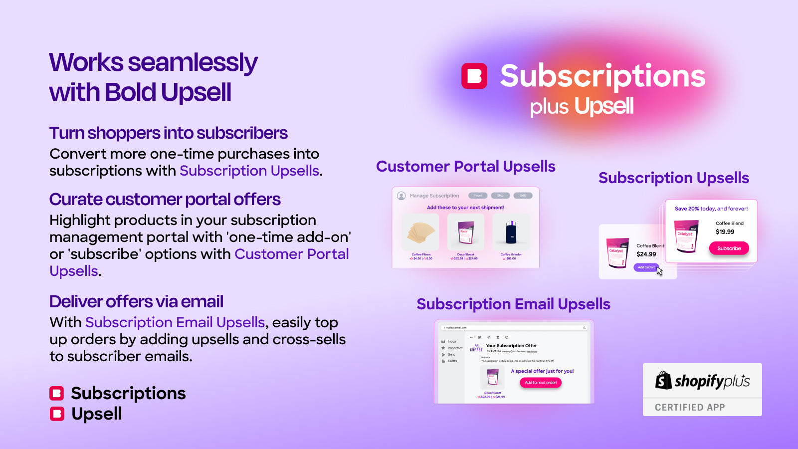 Bold’s MAXIMIZERS™ turn more one-time orders into subscriptions, and increase the value of every subscriber! Subscription Upsells, Convertible Subscriptions, Express Add-ons, Customer Portal Upsells & Subscription Email Upsells. Advanced Prepaid Subscriptions. Built-in cancellation management, dunning. Fully customizable customer portal with Passwordless Login. The subscription app trusted for over a decade. Leading support based in Canada. Switch to Bold and get FREE, white-glove migration.
