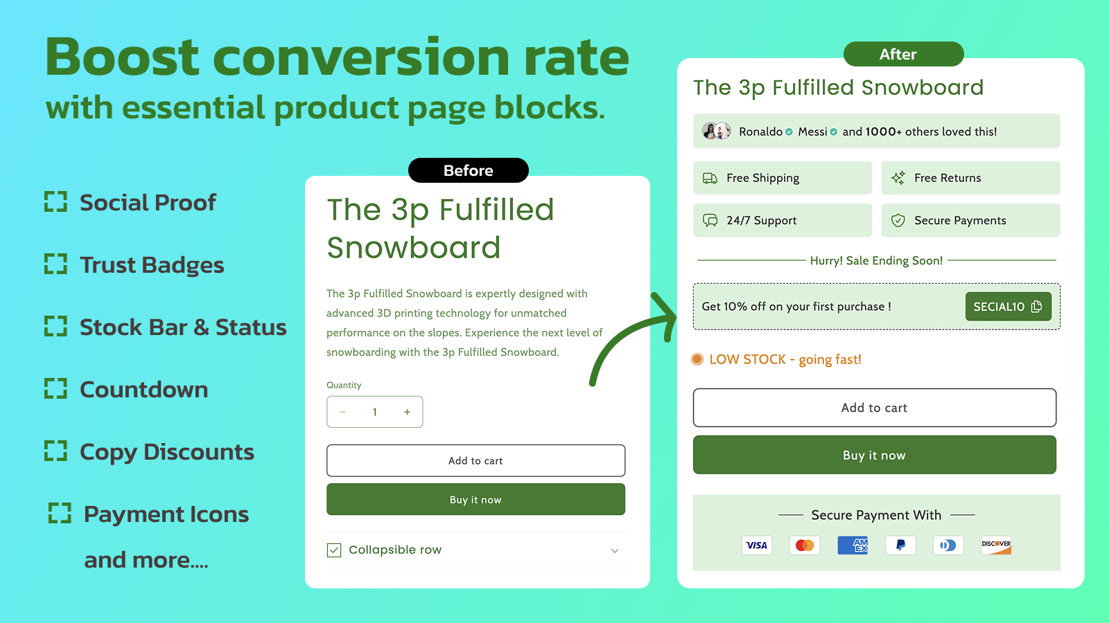 Enhance your conversion rate with a variety of essential blocks for your product page.