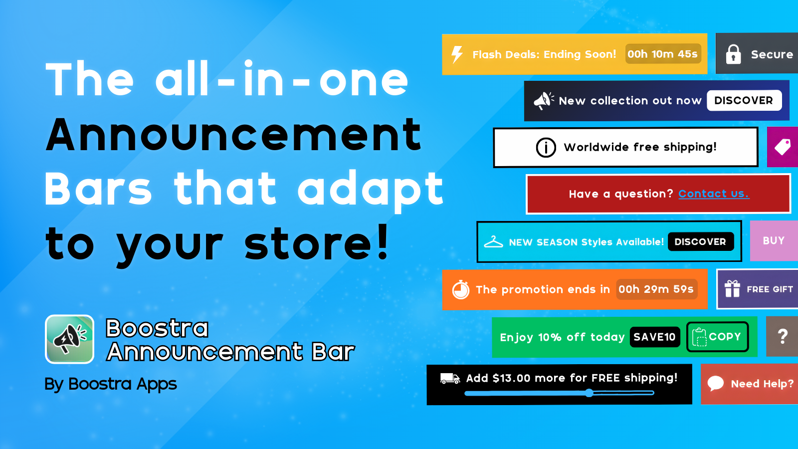 Boostra Announcement Bar helps merchants add announcement bars and notification bars for promos & updates. Show promo messages, countdown timers, copyable promo codes, and shipping goal bars that update with cart value. Create multiple bars, drag & drop reorder, and rotate with slide or fade transitions. Fully customizable: colors, gradients, fonts, icons, buttons, links, close button, position, sticky top or bottom. Target by page, URL and device. Analytics track impressions and clicks per bar.