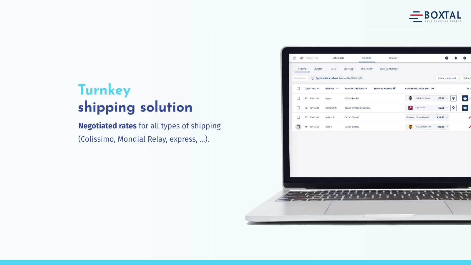Boxtal offers to ship your orders at negotiated rates, without volume conditions. This means you benefit from unique billing and customer service, regardless of the carriers you choose.