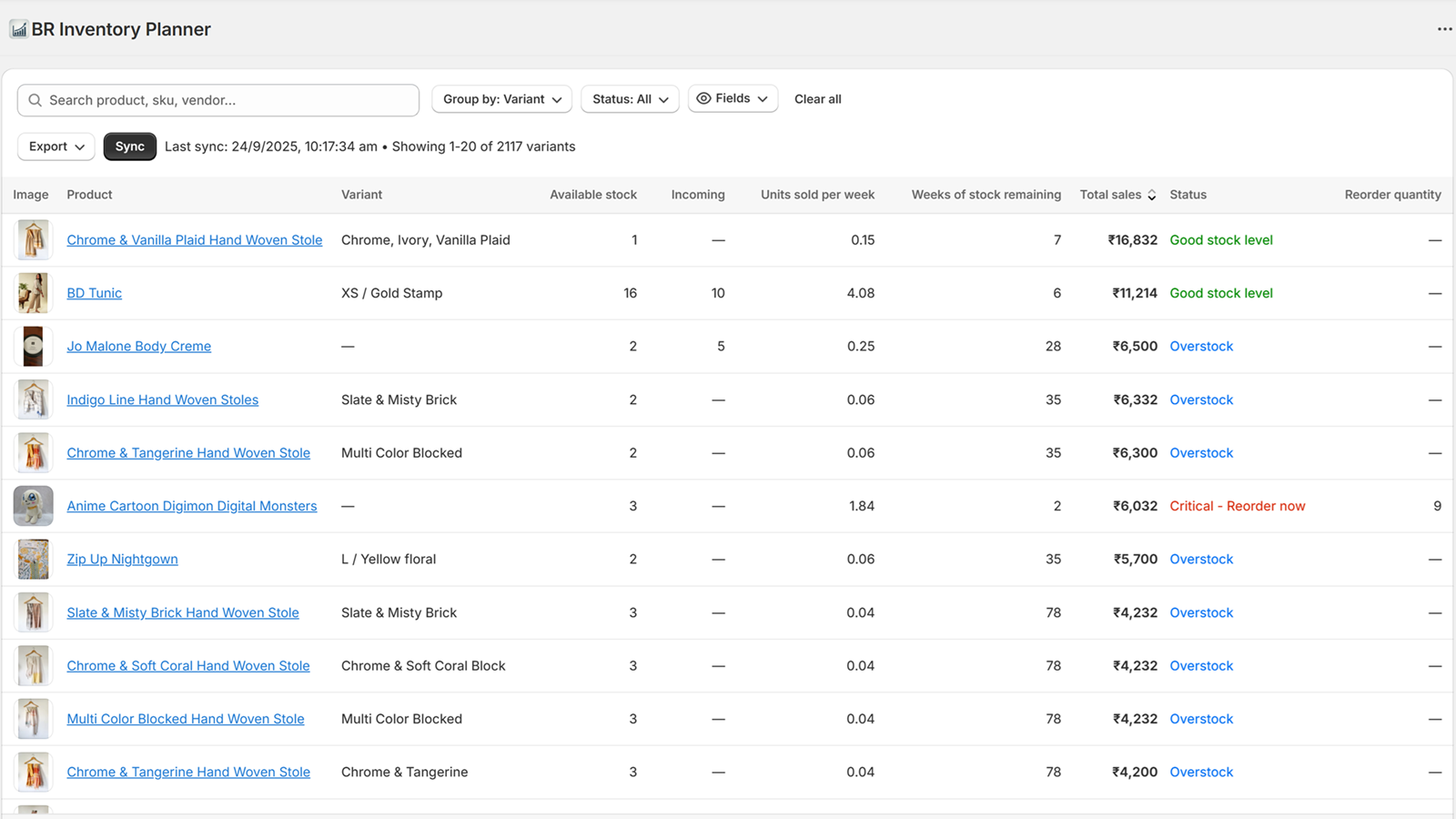 Transform your stock management with data-driven insights and smart inventory forecasts that prevent stockouts and overstock. This app solves one of the biggest challenges for Shopify merchants: knowing exactly when to reorder products by combining historical sales data with current inventory levels to provide actionable insights. Set your lead time, days of safety stock, and minimum order quantity and let our app forecast how much to reorder. Export your reorder report in CSV or Excel format.